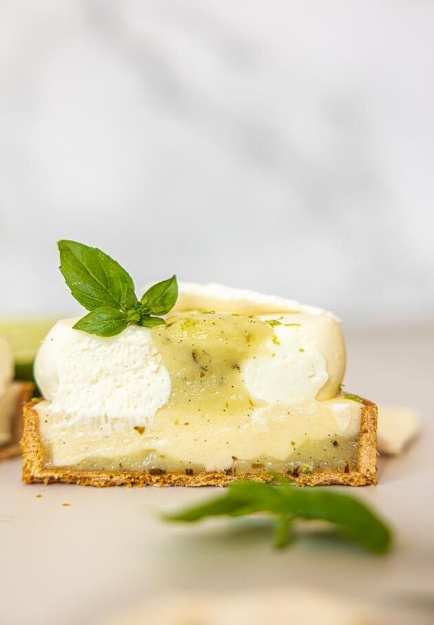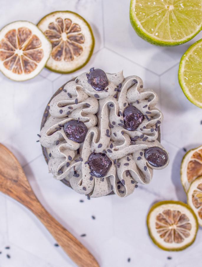 Ingrédients : pâte sucrée charbon végétal, confit citron vert huile d’olive & vanille de Madagascar, crémeux citron vert vanille de Papouasie, ganache montée sésame noir, praliné pur sésame noir, graines de sésame noir grillées